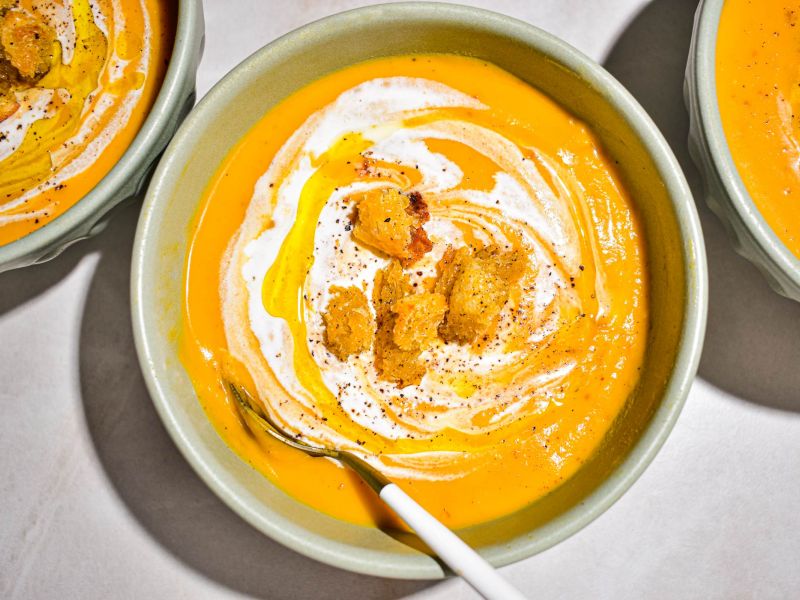 - Divide among bowls to serve and garnish with a spoonful of cream, a drizzle of avocado oil, and a few cracks of pepper. Top with croutons or serve with toasted bread.